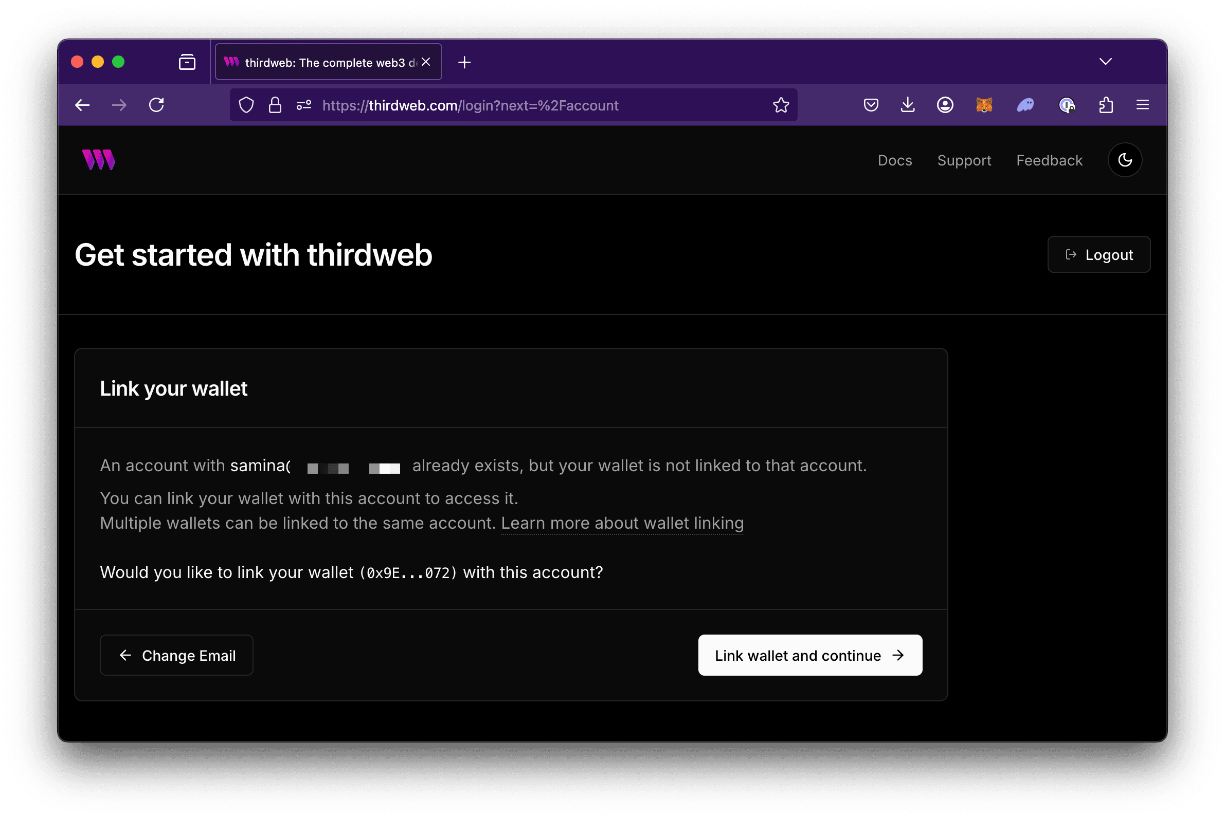 Start by navigating to the thirdweb login portal and login with the wallet you want to link to an existing thirdweb account.