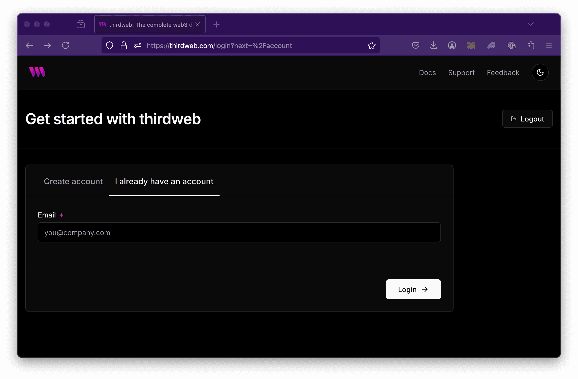Upon signing in, navigate to the "I already have an account" tab and you will be prompted to enter the email address associated with your existing thirdweb account.