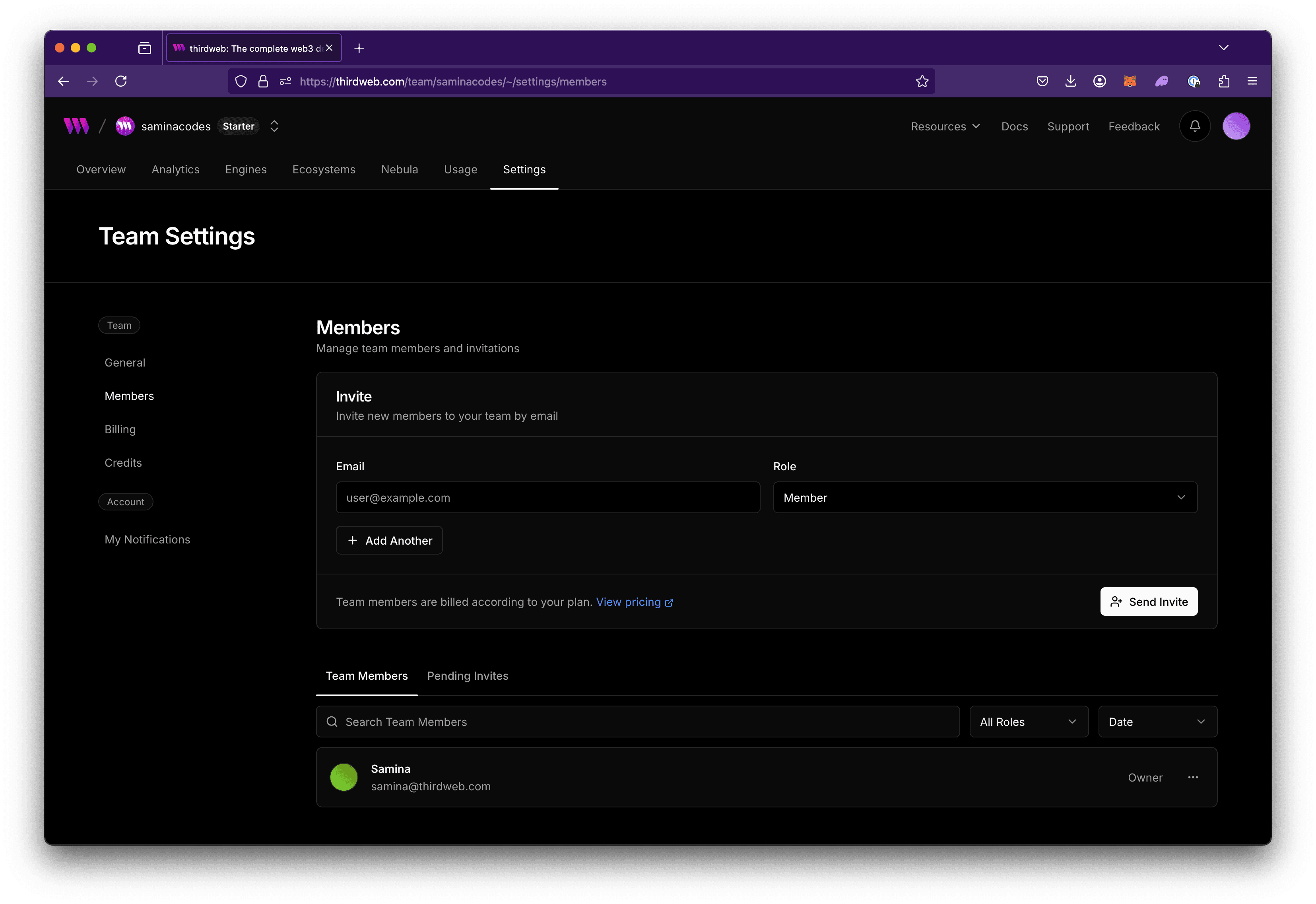 Learn how to invite team members to collaborate on projects and manage billing information in your thirdweb organization.